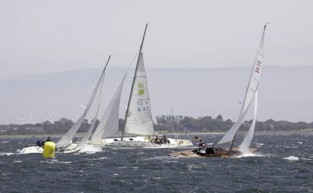 Nach einem langem Am Wind Kurs bei strammem Nordostwind erschienen wir soeben rechtzeitig zur ersten Schlank und Rank Regatta. Axel, Bruno, Dörthe und ich waren von Grömitz gekommen. Es war viel, nach meiner Erinnerung um die sechs Windstärken, in Böen wohl mehr. Der tagelang wehende Nordostwind bescherte uns bei der Kreuz nach Fehmarn ordentlich Seegang.