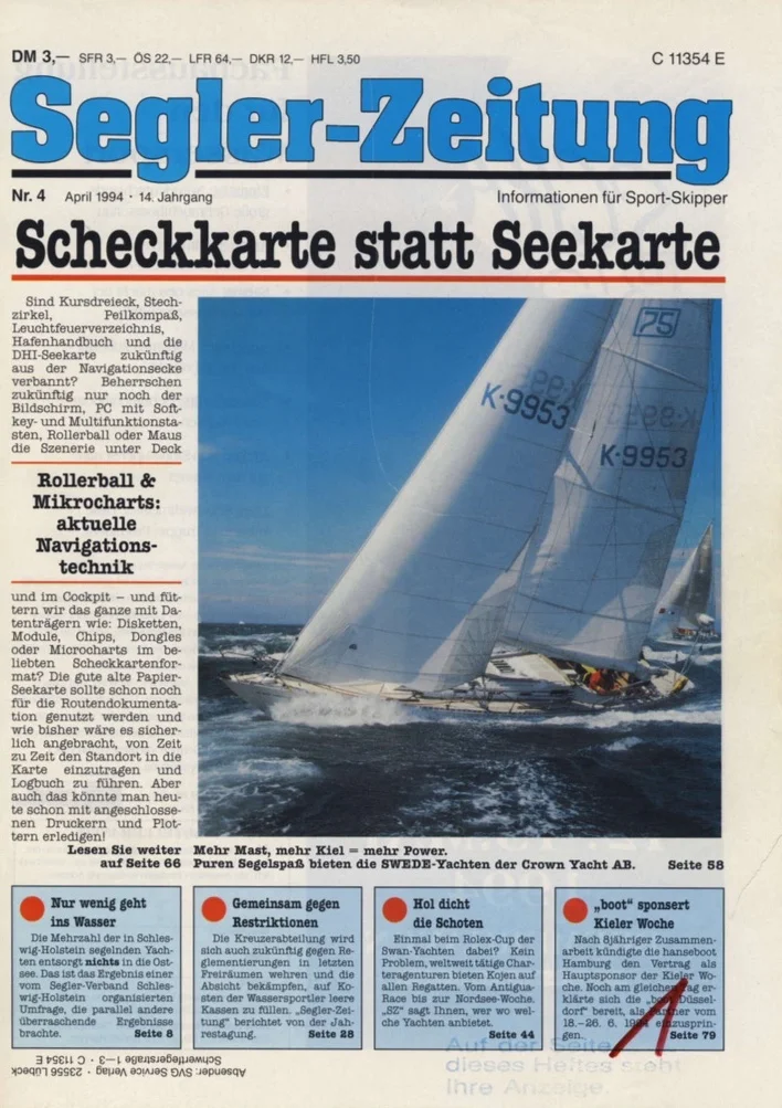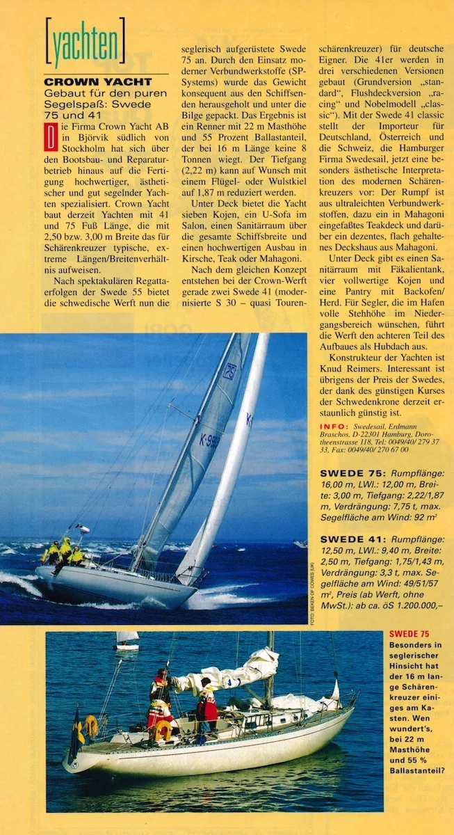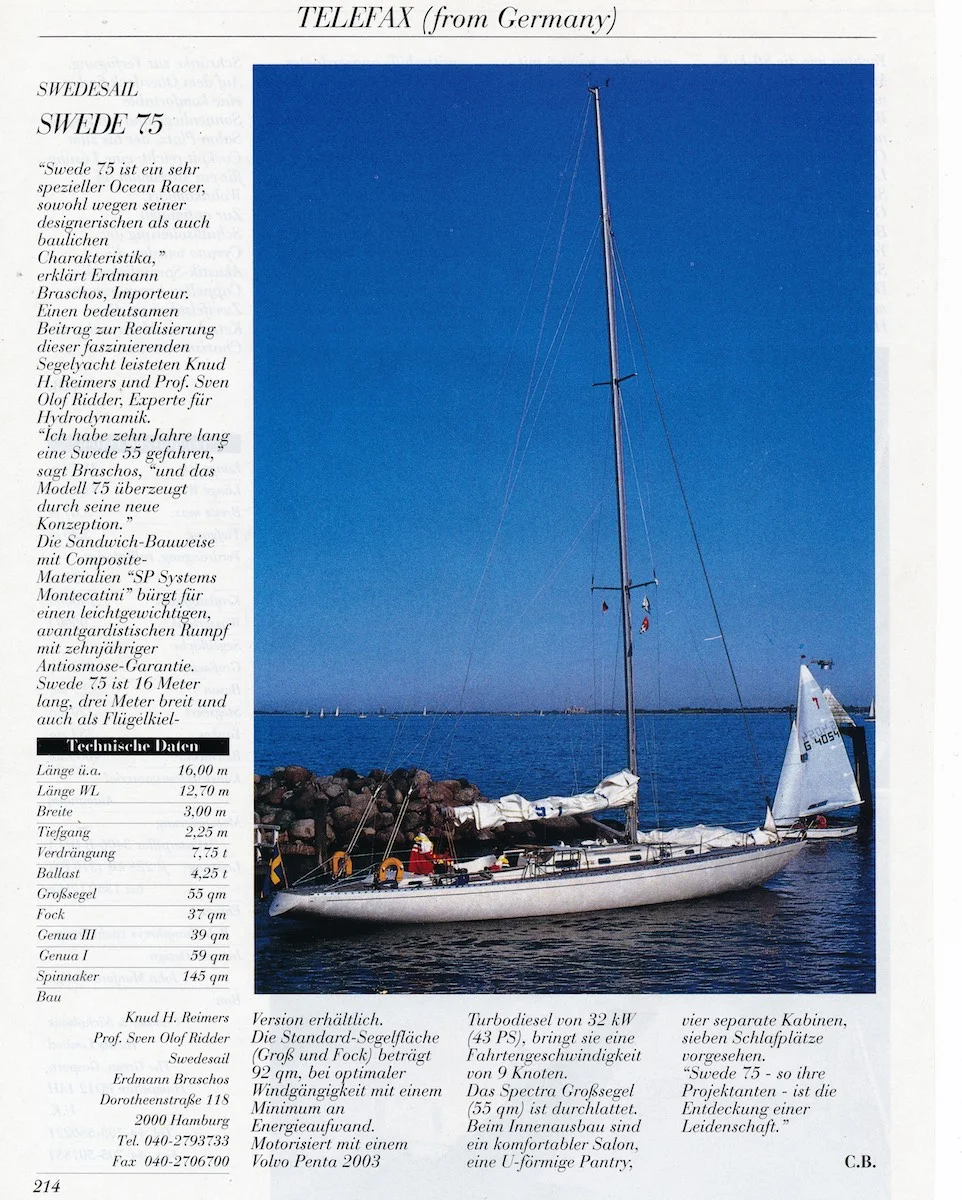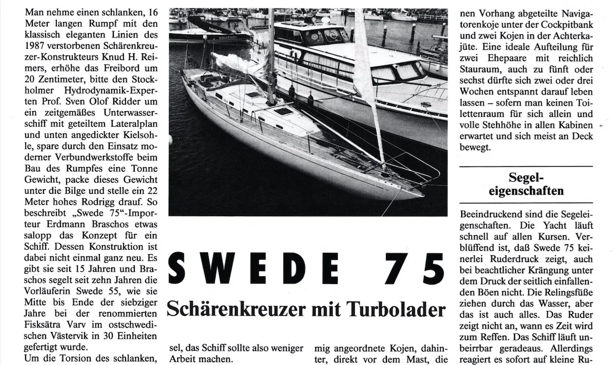 Swede 75 führte 1991 zur Gründung von Swedesail. Im Mai 1992 hatte ich Gelegenheit, das Schwesterschiff namens Niña vor Schilksee in der Kieler Förde und vor Warnemünde mit Interessenten zu segeln. Ein faszinierendes Schiff, das bereits bei leichten Wind beeindruckend läuft, gewissermaßen eine Swede 55 mit Turbolader.